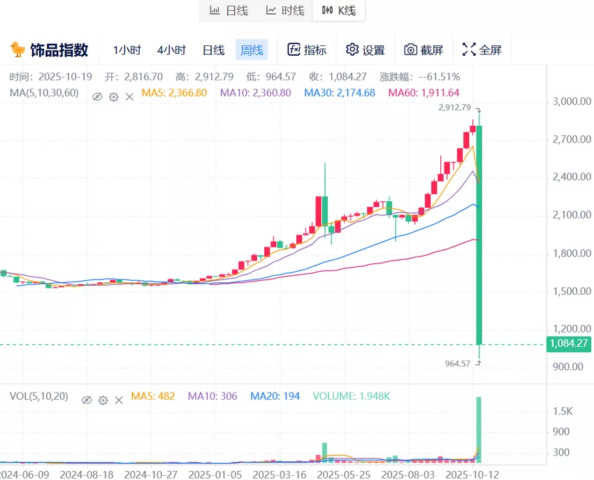 CSQAQ显示的饰品指数,前几天还保持着上涨趋势,但在走至高峰近2800点后,碰上V社补丁更新,骤降至1084点。