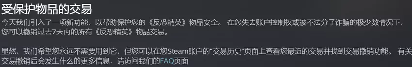 今年7月,V社又给《CS2》更新了交易保护机制。简单来说,饰品在被交易后,会进入为期7天的交易保护期(冷却期),在此期间受保护饰品不可被消耗、修改或转移,若玩家发现自己被诈骗、账号被劫、或者不慎将价值很高的饰品交易出去,可以通过这个机制将饰品要回。但撤回交易、要回饰品的Steam账号会在30天内无法使用Steam市场以及交易功能,并且Steam客服不会提前解封。