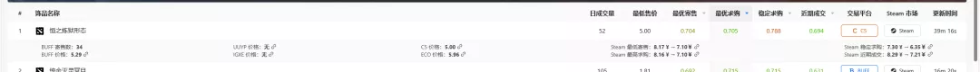 朋友截了张图给我解释,图中《DOTA2》恒之炼狱形态在网易BUFF上的售价为5.29元,在Steam的求购价为8.16元,税后入手收入为7.1元。如果能实时交易+转手,前后可赚不到2元的差价。