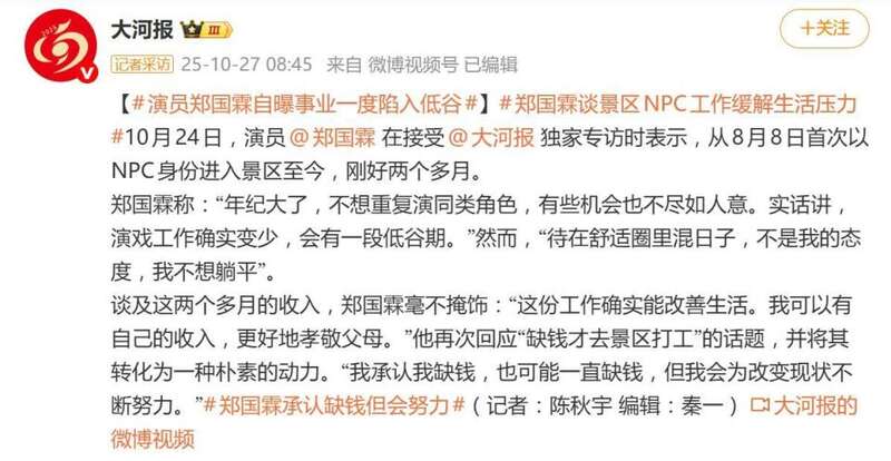 郑国霖景区打工两个月成“顶流NPC”,本人回应:工作量变大,生活有改善