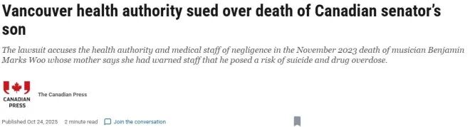 来源:倍可亲(backchina.com) 专题:华裔相关新闻,最新动态!加拿大温哥华海岸卫生局(Vancouver Coastal Health)正面临一宗过失致死诉讼。案件涉及加拿大参议员之子在精神病房失踪四天后,被发现身亡的悲剧。