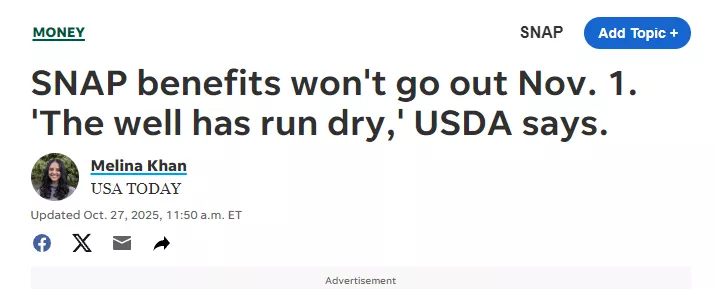 在一份让人心头一紧的官方公告中,美国农业部(USDA)宣布,由于国会迟迟未通过拨款法案,全国数千万低收入家庭的粮食补助(SNAP)将从11月1日起暂停发放。