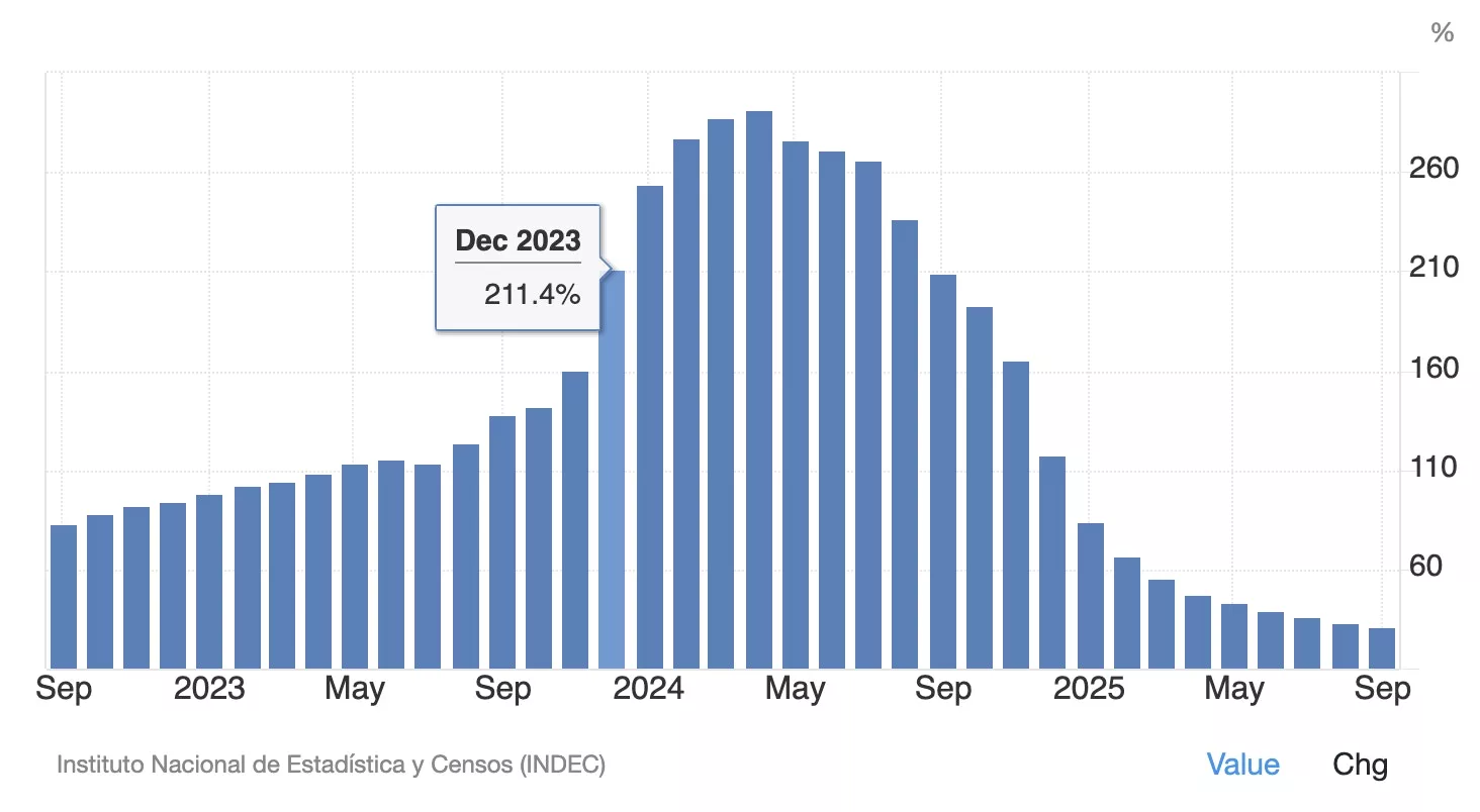 2023年10月,米莱以近乎政治素人的身份当选总统之后,在阿根廷推行“休克疗法”的经济政策,试图从根本上革除阿根廷左翼政府长年实行的贝隆主义(Peronism)左翼政策,削减政府规模、削减福利、容许阿根廷披索贬值、去除政府规管等等,实现了阿根廷政府十多年来首次的财政盈馀,把阿根廷的通胀率从他上台时的超过200%减至今天的31.8%,大大加强了外界对于阿根廷经济“恢复正常”的信心。