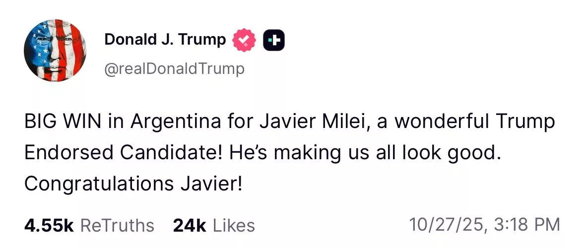川普在Truth Social上恭贺米莱的政党胜选:“米莱在阿根廷大获全胜,他是一位出色的川普支持者!他让我们所有人看起来都很好。”(网站截图)