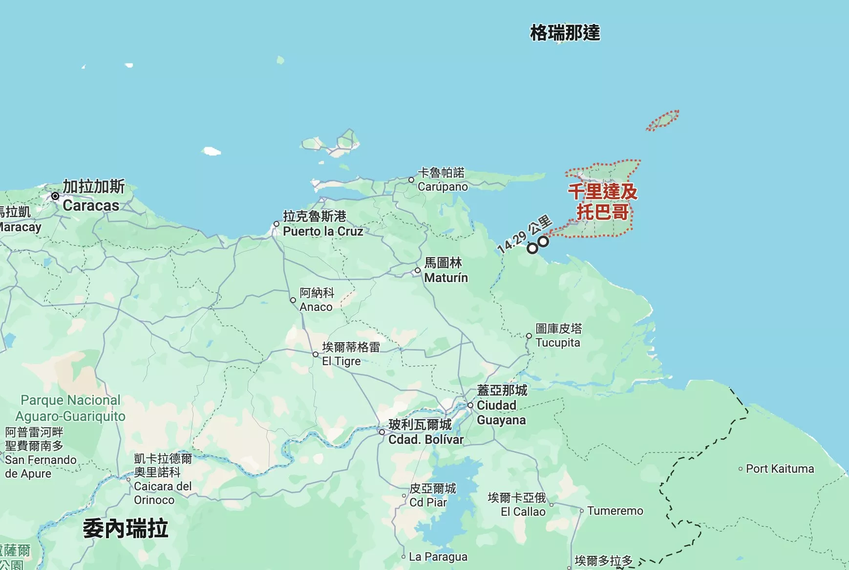 特立尼达和多巴哥(Trinidad and Tobago,又译千里达及托巴哥)离委内瑞拉仅十馀公里。(Google Map)