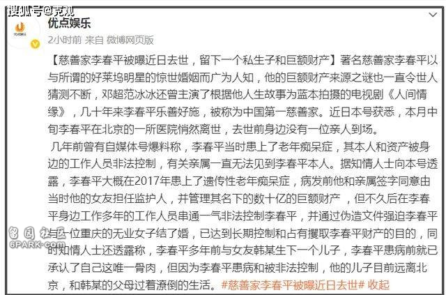 “优点娱乐”报道,慈善家李春平被曝已于近日去世,留下一个私生子和巨额财富。据悉,李春平是于10月中旬在北京一所医院悄然离世,去世前身边没有一位亲人到场。