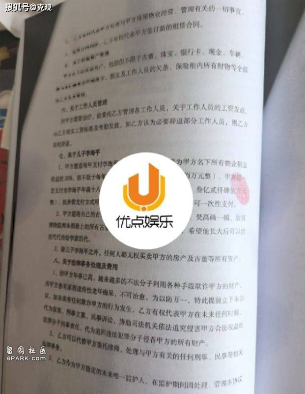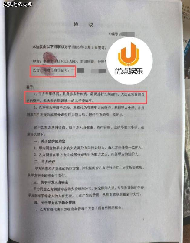 媒体还公布了李春平和女友韩某得协议书。这份协议是在2016年3月签订的,协议中说李春平年事已高且身患多种疾病需要进行长期治疗,无法正常管理自己的财产,也无法亲自照顾唯一的儿子李海平。于是让儿子的生母韩某代为管理资产、照顾儿子。