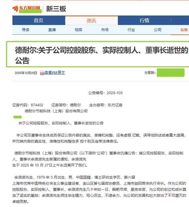 “东方财富网”于28号的时候也曾分享了一则公告,这则公告来自德耐尔,内容便是余浪波的噩耗。