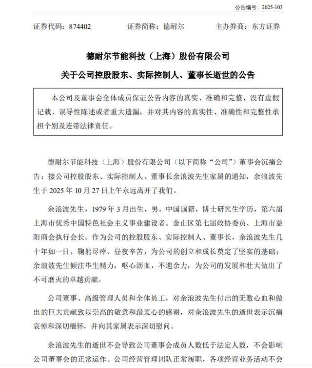 据了解,余浪波生前是上市公司德耐尔的董事长。