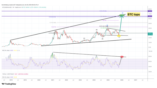 在10月27日发表于X平台的一篇文章中,泽伯格的分析指出,比特币相对于黄金的强势正在形成一个延伸的艾略特波浪形态,目前似乎正进入一个多年周期中的第五浪,也是最后一浪。