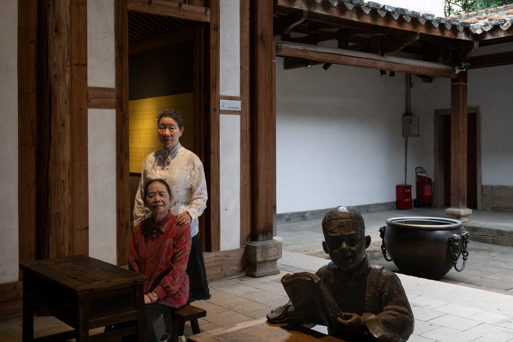 林则徐的后人——林燕怡(音,站立者)与林则徐基金会名誉会长林祝光站在一座林则徐伏案读书的雕像旁。 GILLES SABRIÉ FOR THE NEW YORK TIMES