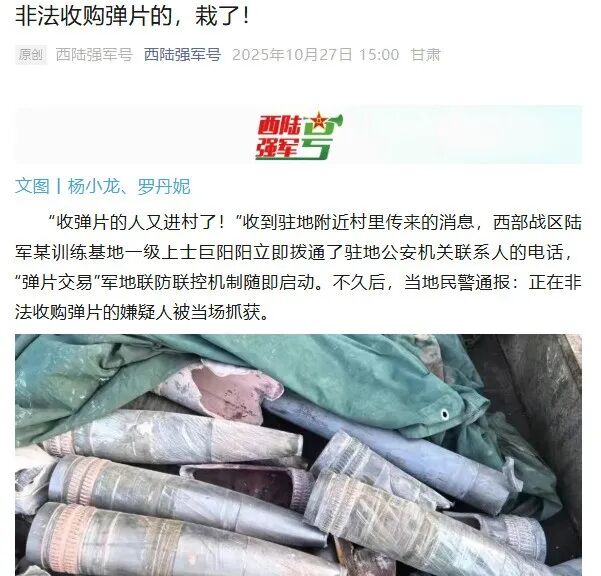 来源:倍可亲(backchina.com)最近,西部战区公布了一起军地联合查获非法盗窃、收购弹片的案件。