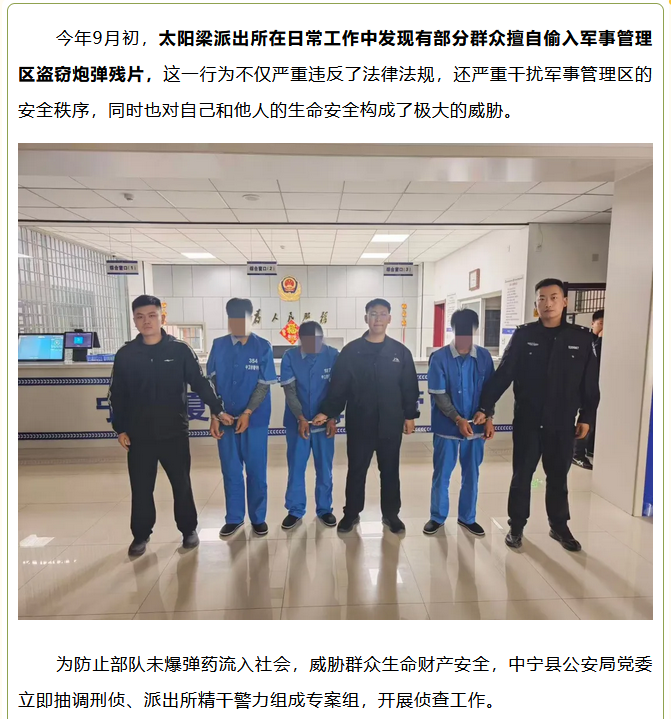 而在9月22日,宁夏中卫公安也披露了一起关于非法收购弹片的案件,涉案人员5人,其中3人是非法拾取弹片的当地居民,另外2人则为废品收购商。犯罪嫌疑人在军事管理区盗窃了炮弹残片累计3吨,涉案金额超过1万元。