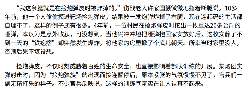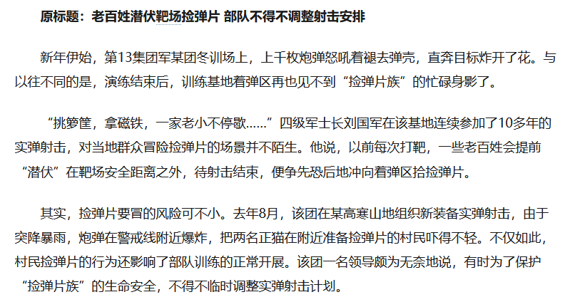 但问题是,他可以不要命的冲进靶场捡炮弹皮,但部队可受不了这个啊。一旦发现有人侵入训练场,训练部队就得立即停火确保对方的安全。如果打靶的时候老乡一个接一个的冲过来,那部队还训不训练了?