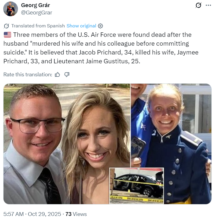 普里查德夫妇是空军基地的文职雇员,杰米在空军生命周期管理中心工作,雅各布在空军研究实验室工作。目前尚不清楚他们与古斯蒂图斯的关系。警方称古斯蒂图斯是他们的同事。空军物资司令部副司令琳达·赫里中将发表声明称:“我们对这起悲剧事件深感悲痛,我们的思念和祈祷与受影响的家庭和亲人同在。”