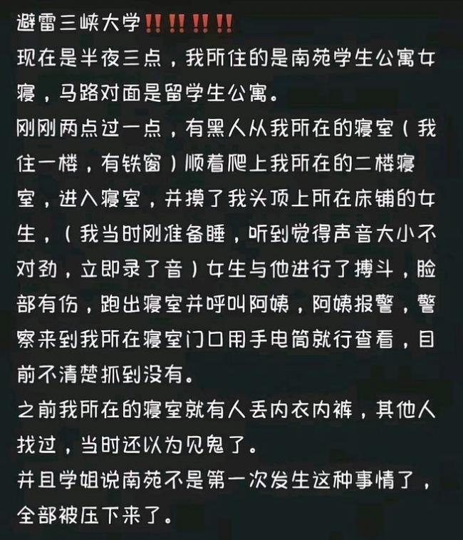 10月28日,另据网易号消息,三峡大学有一个学生发帖称,事发时间在10月25日,在三峡大学南苑女生公寓内,半夜三点,有黑人留学生顺着一楼铁窗爬到二楼女生女生宿舍,进入女生寝室,对正在熟睡的女生进行猥亵。女生被惊醒与黑人留学生发生争斗,脸部被留学生抓伤,宿管阿姨闻讯报警。