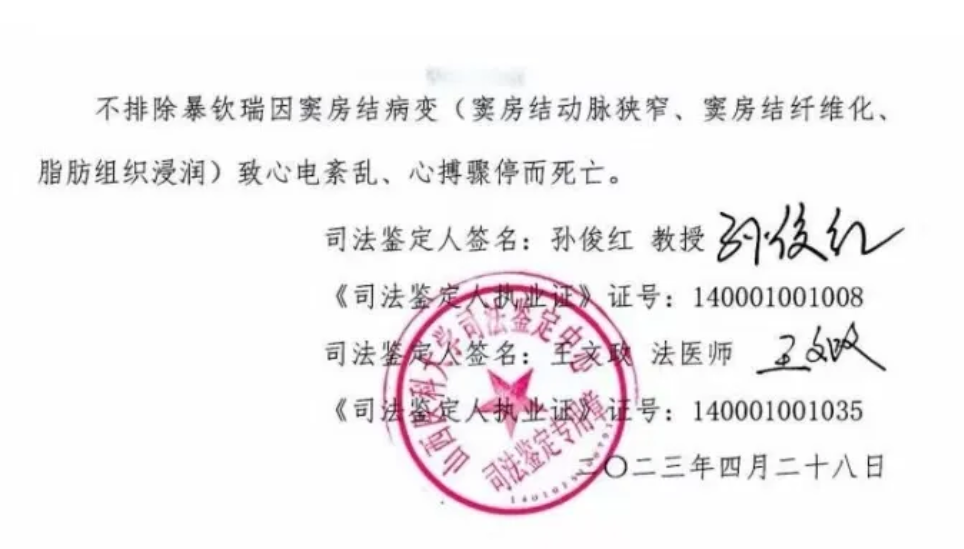 暴钦瑞的死亡原因是什么?2023年3月,石家庄市检察院委托山西医科大学司法鉴定中心进行死因鉴定。该中心出具司法鉴定意见书称,暴钦瑞的死因可以排除机械性损伤,“不排除窦房结病变致心电紊乱、心搏骤停而死亡”。