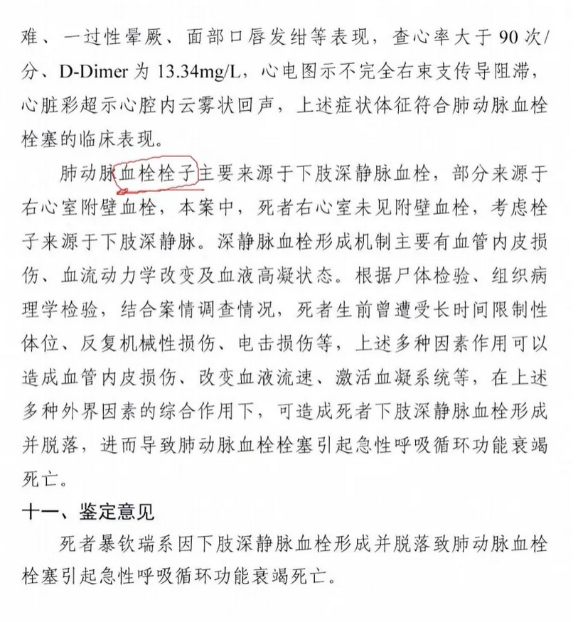 经最高人民检察院司法鉴定中心鉴定,暴钦瑞生前遭受长时间限制性体位、反复机械性损伤、电击损伤等,其下肢深静脉血栓形成并脱落,进而导致肺动脉血栓栓塞,引起急性呼吸循环功能衰竭。