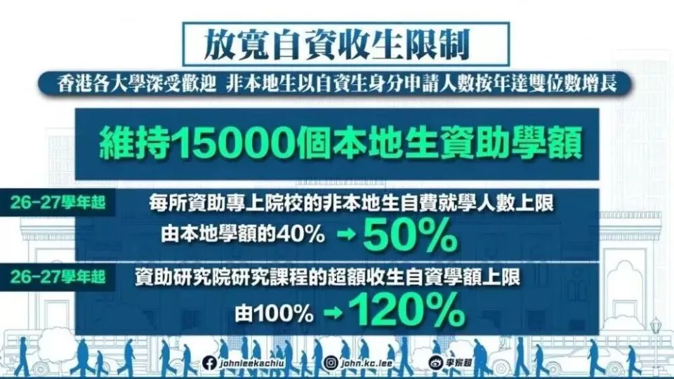 同时,2024年起,香港高校开始了扩招。官方公告里提到,自2024/2025学年开始,特区政府决定放宽“政府资助大学”招收非本地学生的比例限制:原本每所大学的“非本地生”(包括内地、澳门、台湾(专题)及海外学生)占比最多不得超过总入学人数的20%,新政策将这一比例上限提升至40%。