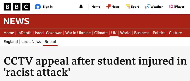 来源:倍可亲(backchina.com) 专题:留学生最新动态近期,英国布里斯托市中心发生了一起种族歧视袭击事件。一名年仅18岁的中国女留学生(专题)遭到陌生女子的攻击,面部受伤入院。
