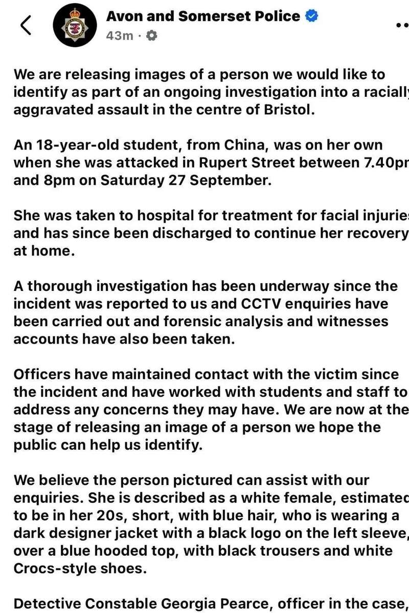 而就在昨天(10月29日),英国警方 Avon and Somerset 在社交媒体上发布了最新通报,公开通缉一名涉嫌种族歧视袭击的女性,并附上监控照片。