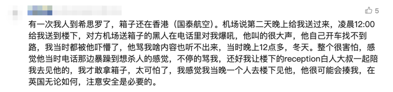 “自己的行李箱被机场工作人员送来的时候,因为对方找不到路就在电话里骂自己,当时感觉非常恐怖。”