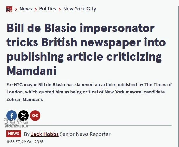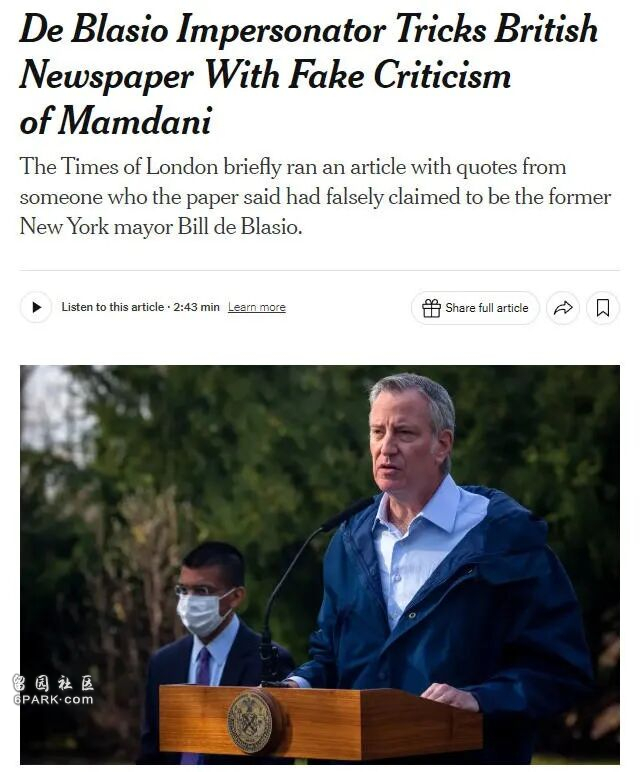 发言人说:“《泰晤士报》发现我们的记者被一名冒充纽约前市长的人误导,而后立即向比尔·德布拉西奥道歉并撤下了文章。”