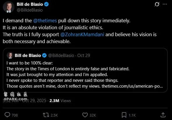 据报道,《泰晤士报》目前已经承认自己搞错,已经就此事向德布拉西奥致歉,并删除了原文。