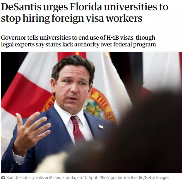 德桑蒂斯在声明中表示,“全国的大学正在通过 H-1B 签证引进外国劳工,而不是聘用具备资格、可立即上岗的美国人。我们不会容忍佛州高校滥用 H-1B 项目,因此我已指示州立大学理事会立即终止这种做法。”