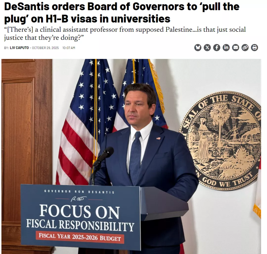 来源:倍可亲(backchina.com) 专题:移民、绿卡相关新闻汇总!佛罗里达州州长罗恩·德桑蒂斯(Ron DeSantis)周三(10月29日)发布声明,要求全州各大学停止通过 H-1B 签证项目聘用国际员工,引发各界关注。