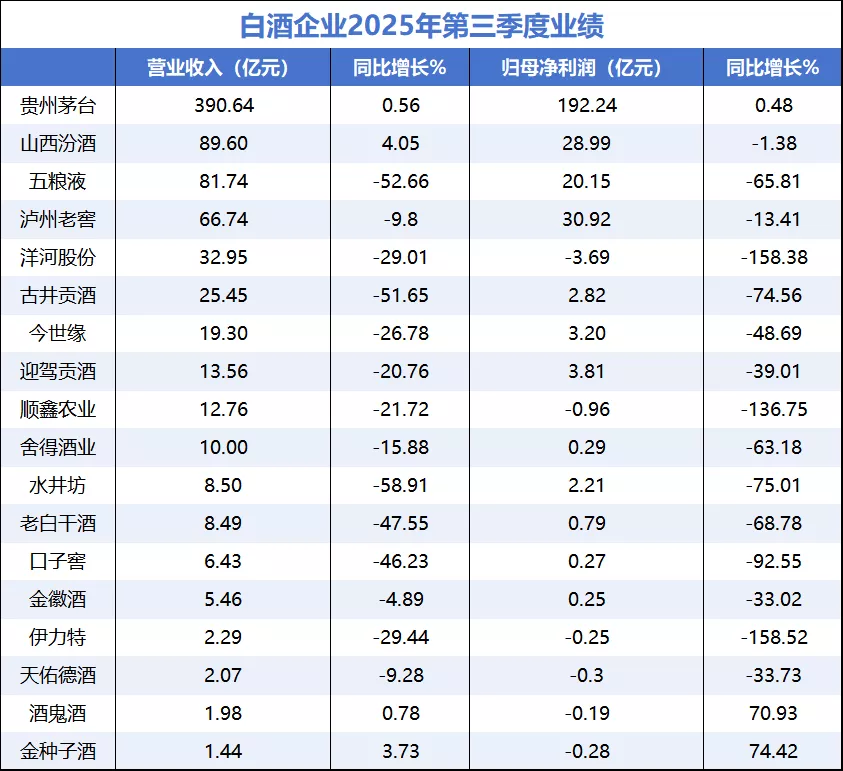 到 10月30日晚上,白酒上市公司三季报基本披露完毕,除了贵州茅台(600519.SH)勉强双增,泸州老窖略有下滑,其他酒企的业绩很多都惨不忍睹。