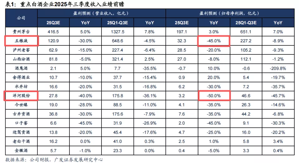 市场对于白酒行业业绩进一步下滑早有预测。今年10月中旬,广发证券曾发布研报预测白酒企业三季度业绩,其中对五粮液业绩降幅的预计值远高于其余券商,一度引发市场广泛关注。