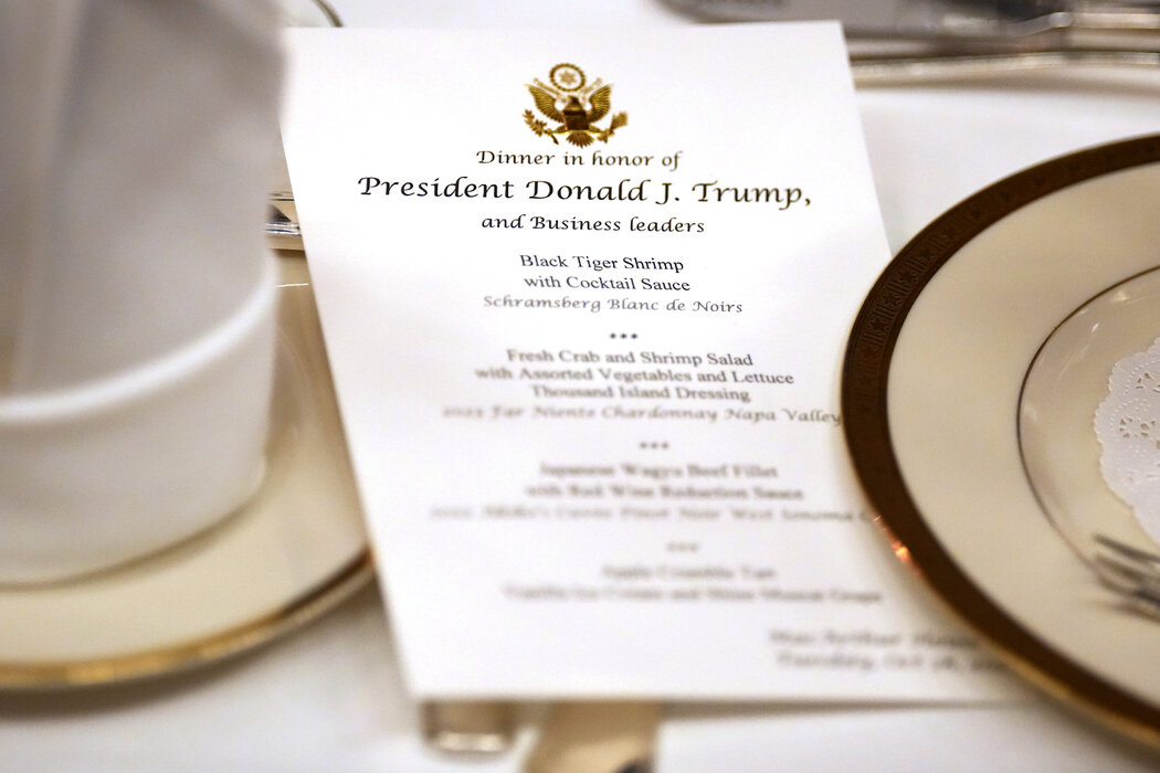 周二在美国驻东京大使官邸举行的晚宴菜单,该晚宴招待了特朗普总统及商界领袖。 ANDREW HARNIK/GETTY IMAGES