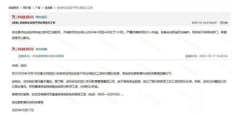 记者注意到,岳池县教育科技和体育局于2025年10月17日通过官方渠道作出回应:经核实,教师反映的情况基本属实。岳池师达实验学校所属的四川冬石教育管理集团公司因周转资金困难,导致部分教职员工的工资及社保被拖欠。学校已向集团公司汇报此情况,并正积极筹措资金,将陆续补发拖欠工资并缴纳社保和公积金。