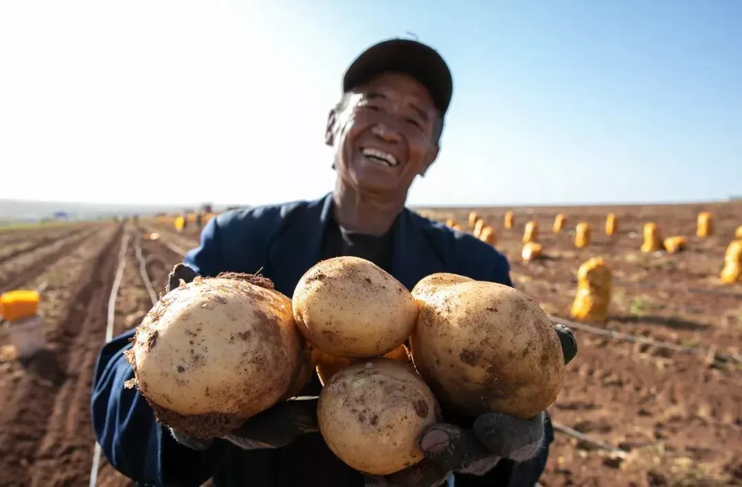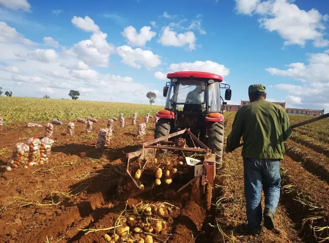 每年9月秋收时,大型农机开进广阔的农田,一垄垄地翻出地底下的土豆。大土豆经过人工分拣装袋,小土豆留在地表,静待明年翻耕时做成有机肥。