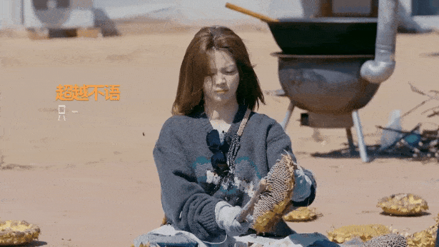 综艺节目里,杨超越麻利敲花盘,网友称她是“天选种田文女主”。(图/《非来不可3》)
