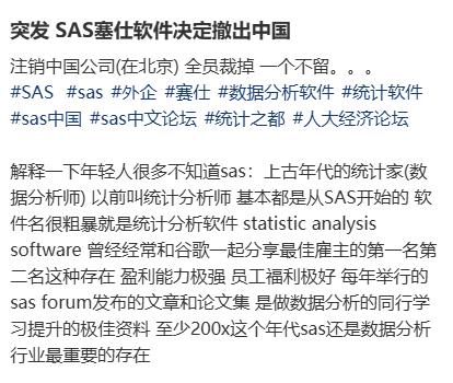 年收入超过30亿美元的全球数据分析软件巨头SAS公司疑似已全面终止在华业务运营。官网简体中文内容消失、中国区办公地点信息被抹除、员工集体裁撤等一系列迹象显示,这家曾服务中国银行、中国海关等核心机构的美国软件企业,正以一种低调方式结束其在中国市场长达三十年的存在。