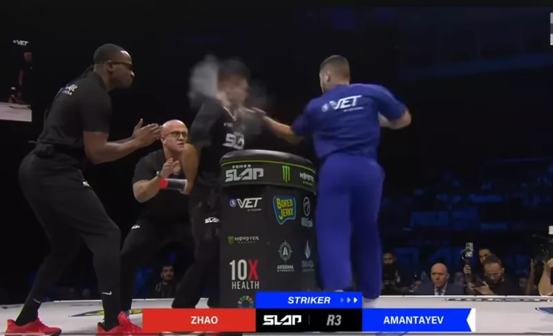 “Power Slap”由美国UFC创办人打造,以“耳光对打”为主题,强调爆发力与抗击耐性。这场比赛由赵鸿刚对上哈萨克选手阿曼塔耶夫(Muhammad Amantaev),双方轮流以全力掌击对方脸部。开赛第一轮,赵鸿刚面对阿曼塔耶夫猛力出手、掌风呼啸落脸,眼角当场爆血、脸部歪斜,现场观众惊呼不断,他强忍痛楚回击,但落点偏移、力道不足,未能造成威胁,气势明显下滑。