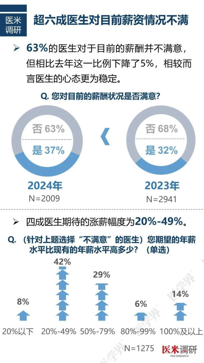 更早前,医学界和医米调研发布的《2024年度中国医院人力资源现状调研报告》显示,2009名参与调研的医生中,降薪的医生比例从2023年的50%增加到57%。