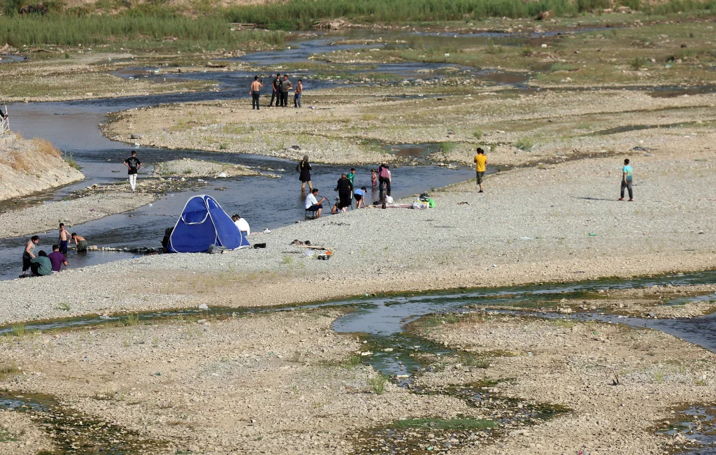 当地时间2025年8月25日,伊朗德黑兰北部法沙姆地区,伊朗民众在一个几乎干涸的河床内野餐。