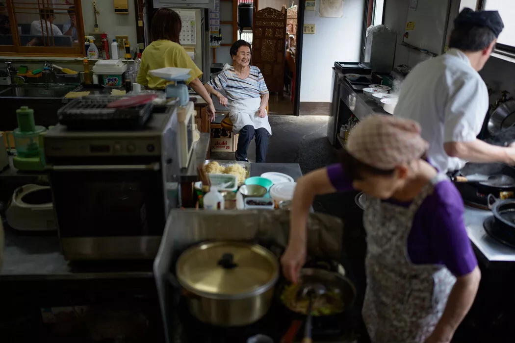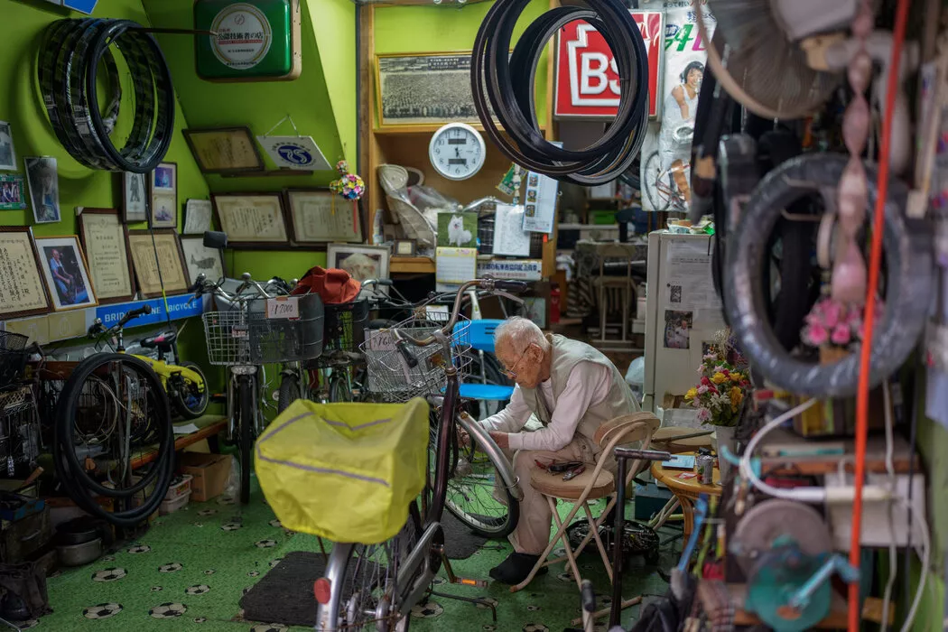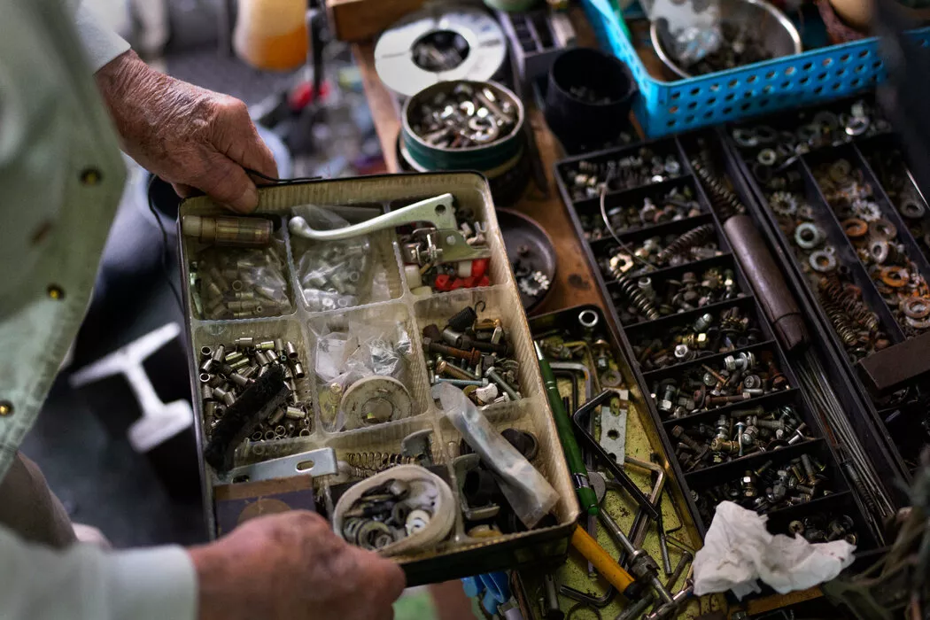 石井经历过战争年代,那时一切都没有保障。修车所得是他每月5万日元(约330美元)养老金之外的一份补充。“你永远不知道会发生什么,”他在店后那间杂乱的厨房里为自己煮味噌汤,一边说道。