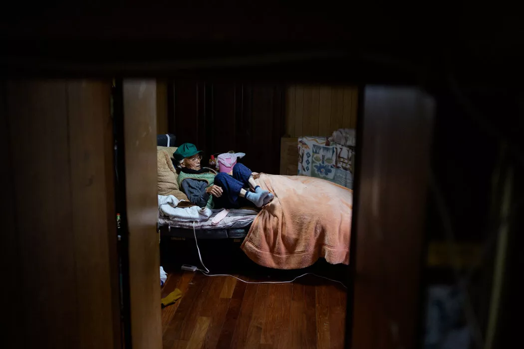 战胜过食道癌、又在99岁高龄挺过新冠的松尾,在周末会和一岁大的曾孙时君玩耍。每日耕作结束后,他回到屋内,坐在厚重棉被覆盖的暖桌旁休息。他钻进被炉的温暖中,身后的窗台上有蚱蜢跳跃。