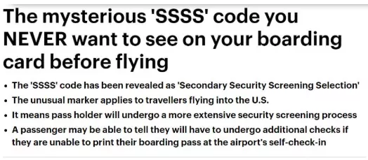 SSSS 是美国国土安全部(Department of Homeland Security)所使用的“Secondary Security Screening Selection(二次安全检查选定)”的缩写。它通常以四个字母的形式出现在登机牌上,提醒安检人员对该乘客进行额外的安全检查。旅客在美国境内航班以及往返美国的国际航班上都有可能收到 SSSS 标记。