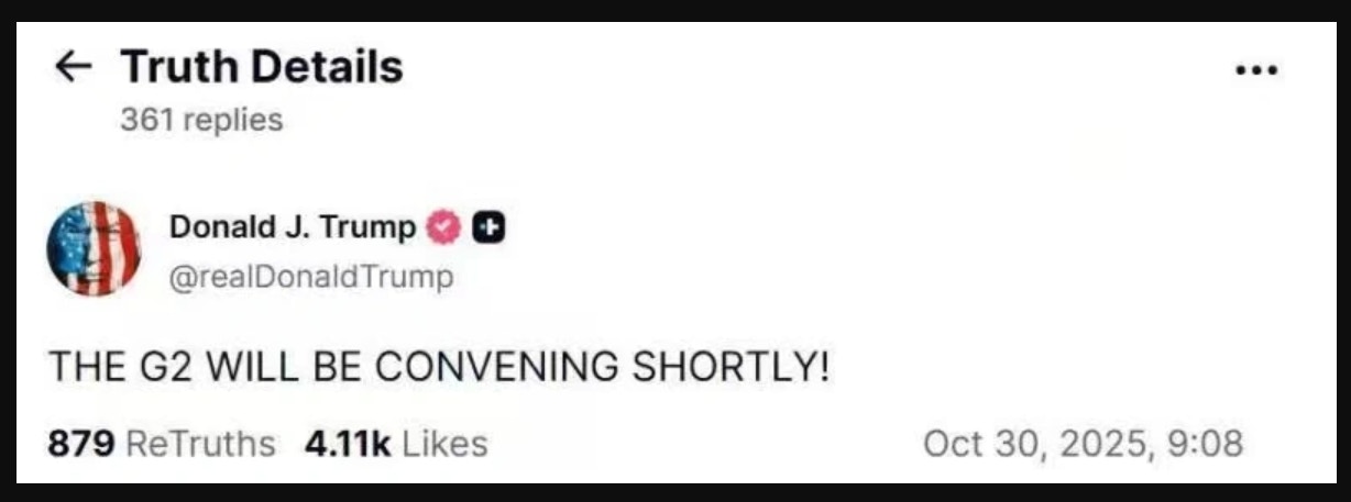 特朗普第二次当选上任以来至少两次提到的「G2」世界。第一次是在今年入主白宫后不久,他当时说,中美合作可以搞定世界上绝大部分事情(当时还没有直接说G2)。第二次是在韩国釜山会晤之前,这次特朗普说的更为直白,而且全部是用大写字母:「THE G2 WILL BE CONVENING SHORTLY!」(G2即将开会!)这一细节不仅反映出他对即将举行的中美会晤的期待,更反映出他对中美关係重要性的认知。