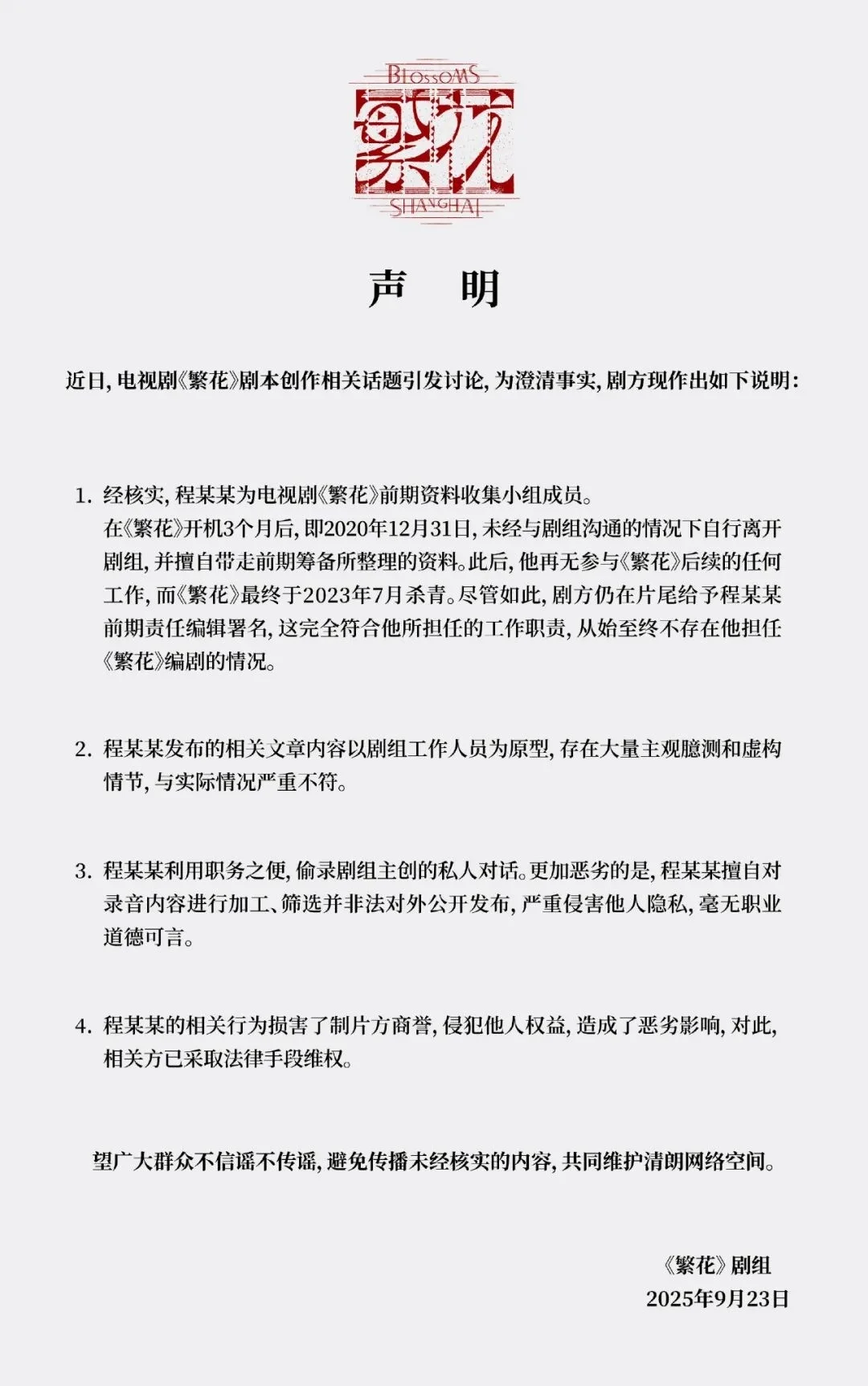 1. 经核实,程某某为电视剧《繁花》前期资料收集小组成员。在《繁花》开机3个月后,即2020年12月31日,未经与剧组沟通的情况下自行离开剧组,并擅自带走前期筹备所整理的资料。此后,他再无参与《繁花》后续的任何工作,而《繁花》最终于2023年7月杀青。尽管如此,剧方仍在片尾给予程某某前期责任编辑署名,这完全符合他所担任的工作职责,从始至终不存在他担任《繁花》编剧的情况。