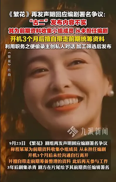9月23日,《繁花》剧组再次发布声明,回应近期的编剧署名争议。