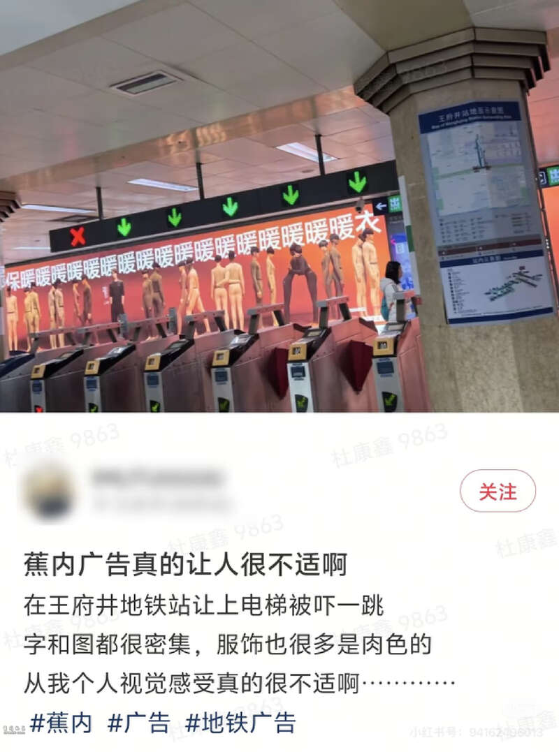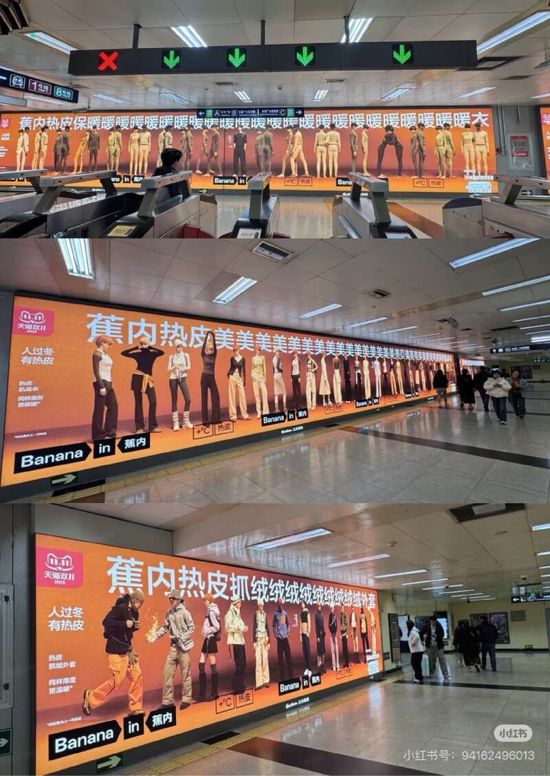 从现场图可见,该广告以大幅电子屏形式呈现,展示了多位身着蕉内热皮系列内衣的模特形象,画面风格较为写实。不少网友认为,这样的广告内容在地铁公共空间展示“过于暴露”“观感不适”,纷纷吐槽其“辣眼睛”“吓一跳”,呼吁相关方对广告进行调整。