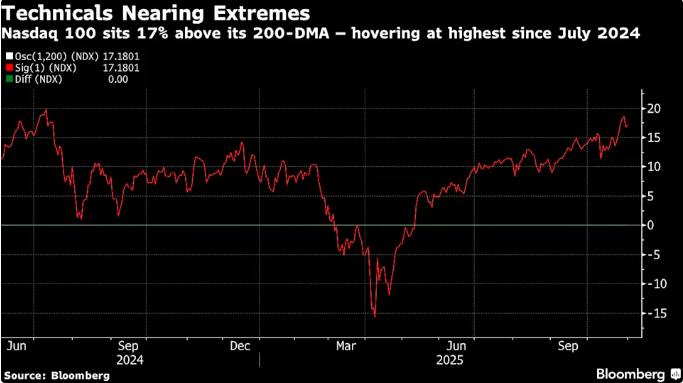 目前,纳斯达克100指数的交易价格也比其200日均线高出17%——接近2024年7月以来的最大差距,而就在2024年8月,日元套利交易引发股市抛售,震荡了整个全球市场。