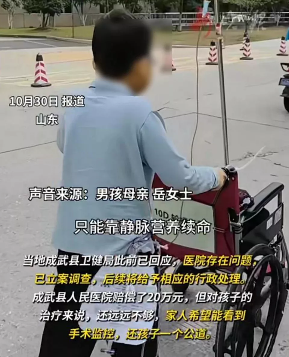 来源:倍可亲(backchina.com)“我要回家”一名12岁男童哭诉。2年前在学校玩,肚子遭到撞击,事后因腹痛持续,在妈妈陪同下前往就医,起初医师以为是“血块”引起疼痛,未料进一步检查、开刀进行手术后,6个器官遭到切除;如今男童无法正常进食,仅能以灌输营养液维生。对此当地卫生局也立案调查医疗纠纷。