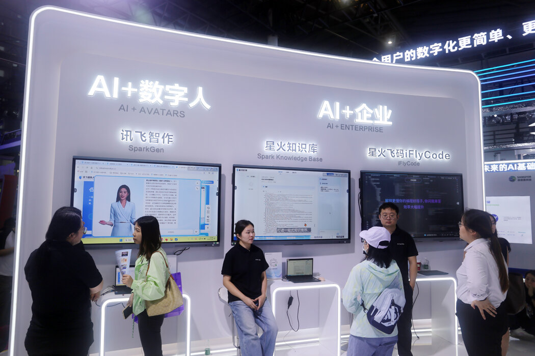 7月,上海一个展会上科大讯飞人工智能模型的展位。人权组织指控科大讯飞协助中国政府利用语音特征压制部分民众。 COSTFOTO/NURPHOTO, VIA GETTY IMAGES